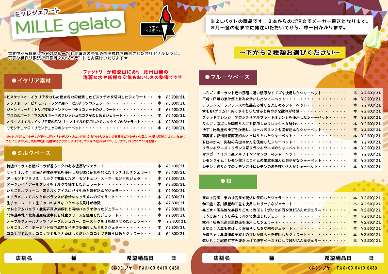 「ミッレ・ジェラートラクトアイスピスタチオ」につきまして、イタリア産ピスタチオの著しい不作のため「シチリア・ブロンテ産」から「イタリアおよび各国産ピスタチオの混合」へ順次切替させていただくことになりました。切替時期は現在庫終了次第となります。ご了承の程お願い申し上げます。(2025年11月現在)